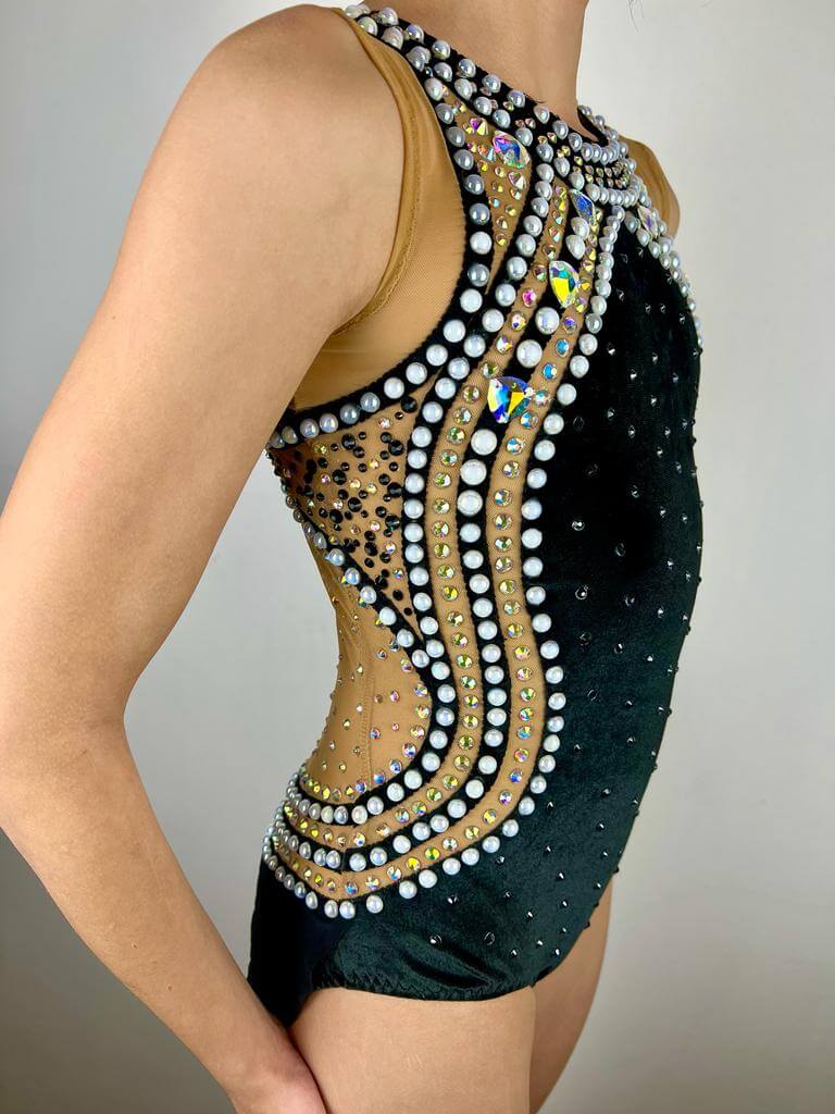 Rhythmic gymnastics leotard, for height around 146 cm, girth 60cm, hips 2x28cm, bust 2x30-31 cm. All measurements without stretching.
