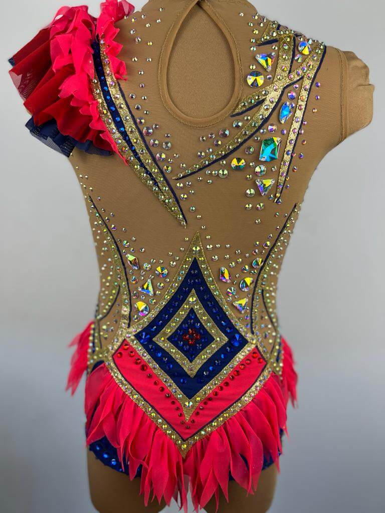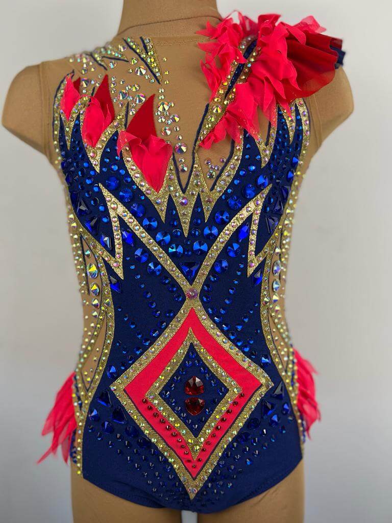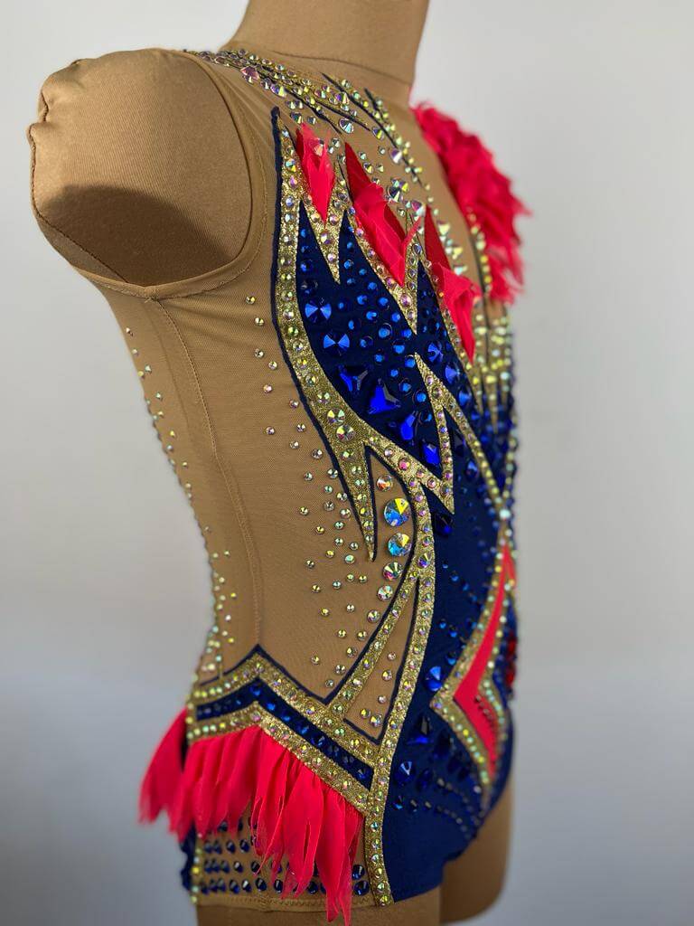 Rhythmic gymnastics leotard, for height around 134-146 cm, girth 58cm, hips 2x28.5cm, bust 2x31 cm. All measurements without stretching.