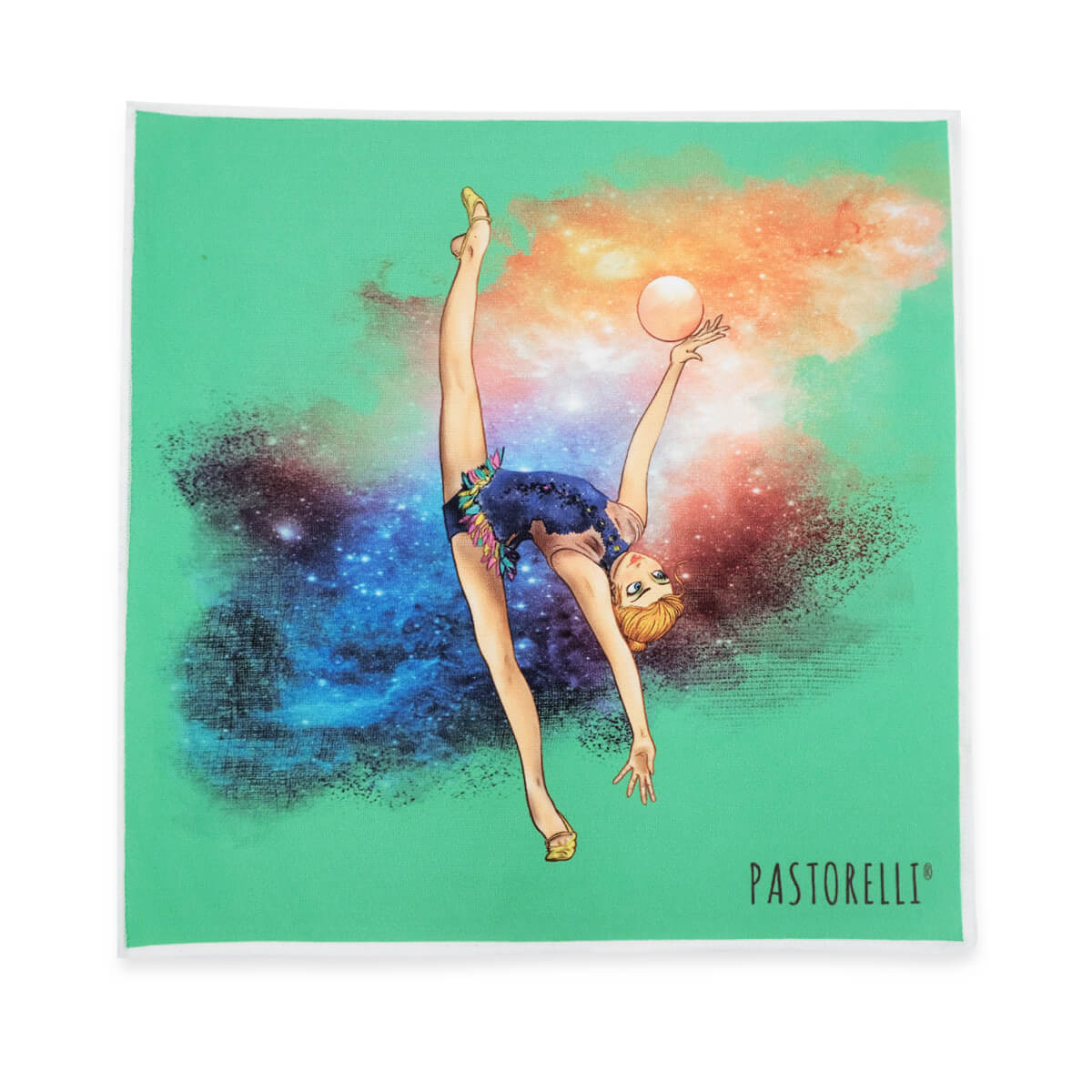 Microfiber cleaning cloth portraying a gymnast a ball printed on it. Suitable for cleaning any kind of gym ball. Both sides can be used to clean balls. To be used dry or slightly wet without soap.